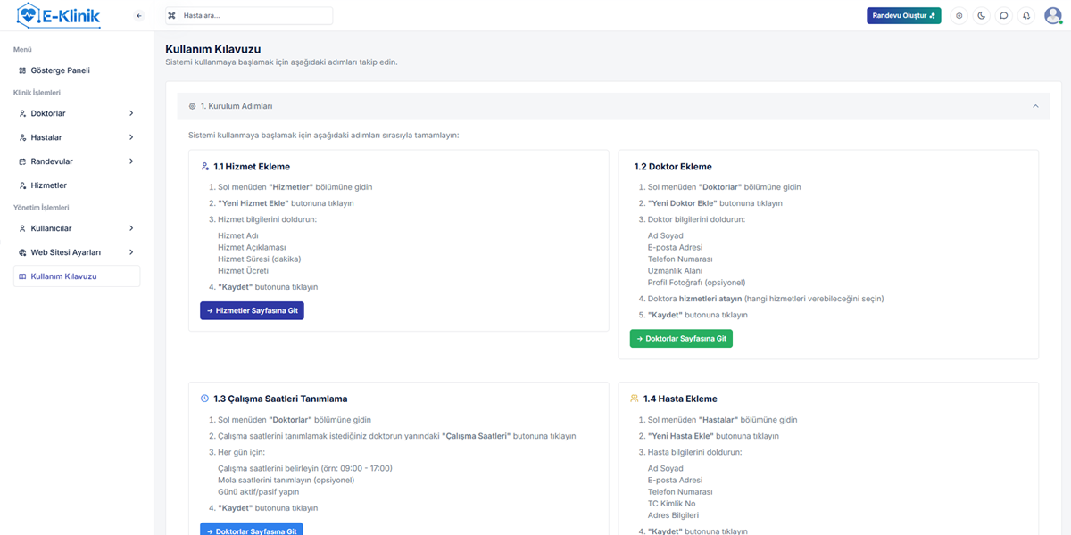 Doktor bilgilerini sisteme ekleyin, çalışma saatlerini ve hizmetlerini tanımlayın.