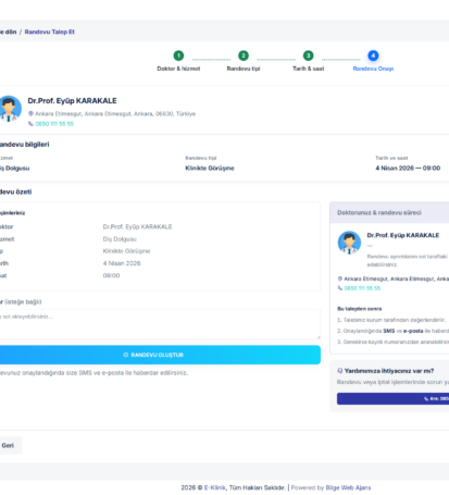 E-Klinik Randevu Sistemi Nedir? Özellikleri, Avantajları ve Kliniklere FaydalarıE-Klinik randevu sistemi ile hasta randevularınızı kolayca yönetin. Online randevu, SMS hatırlatma, doktor yönetimi ve muhasebe modülü ile kliniğinizi dijitalleştirin.Günümüzde sağlık kuruluşları için hızlı, düzenli ve hatasız randevu yönetimi büyük önem taşır. E-Klinik Randevu Sistemi, kliniklerin ve sağlık merkezlerinin tüm randevu süreçlerini dijital ortamda yönetmesini sağlayan, kullanıcı dostu ve kapsamlı bir yazılımdır.
